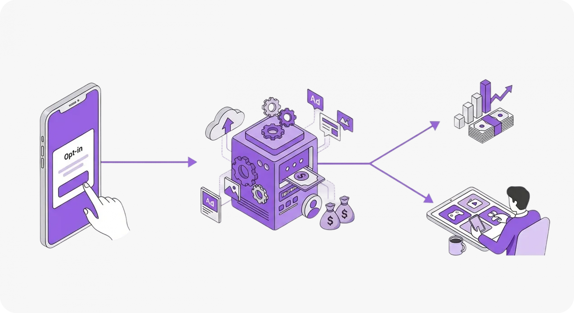 광고 영업, 정산, 운영. 복잡한 과정은 저희가 전담합니다. 당신은 사용자 동의(Opt-in)만 받으세요. 탑재된 '캐시백 웹'이 알아서 유저를 활성화하고 혜택을 제공하며 매출을 발생시킵니다. 귀사의 인력은 앱 서비스 본질에만 집중하세요.